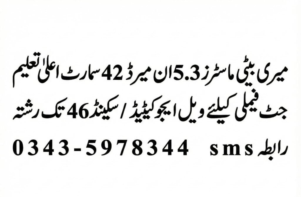 اہور سے سنی سید بخاری کاسٹ کی 27سالہ خوبصورت کنواری بیٹی، قد 5.4، تعلیم بی بی اے آنرز، گھر اعوان ٹاؤن لاہور، والد ریٹائرڈ گورنمنٹ جاب، والدہ فوت، تین بھائی ایک شادی شدہ، ایک بہن شادی شدہ۔ ڈیمانڈ/ترجیحات: صرف لاہور سے سید یا پھر کسی میچنگ کاسٹ میں 30سال تک کے کنوارے اعلیٰ تعلیم یافتہ برسرروزگار لڑکے کا رشتہ درکار ہے